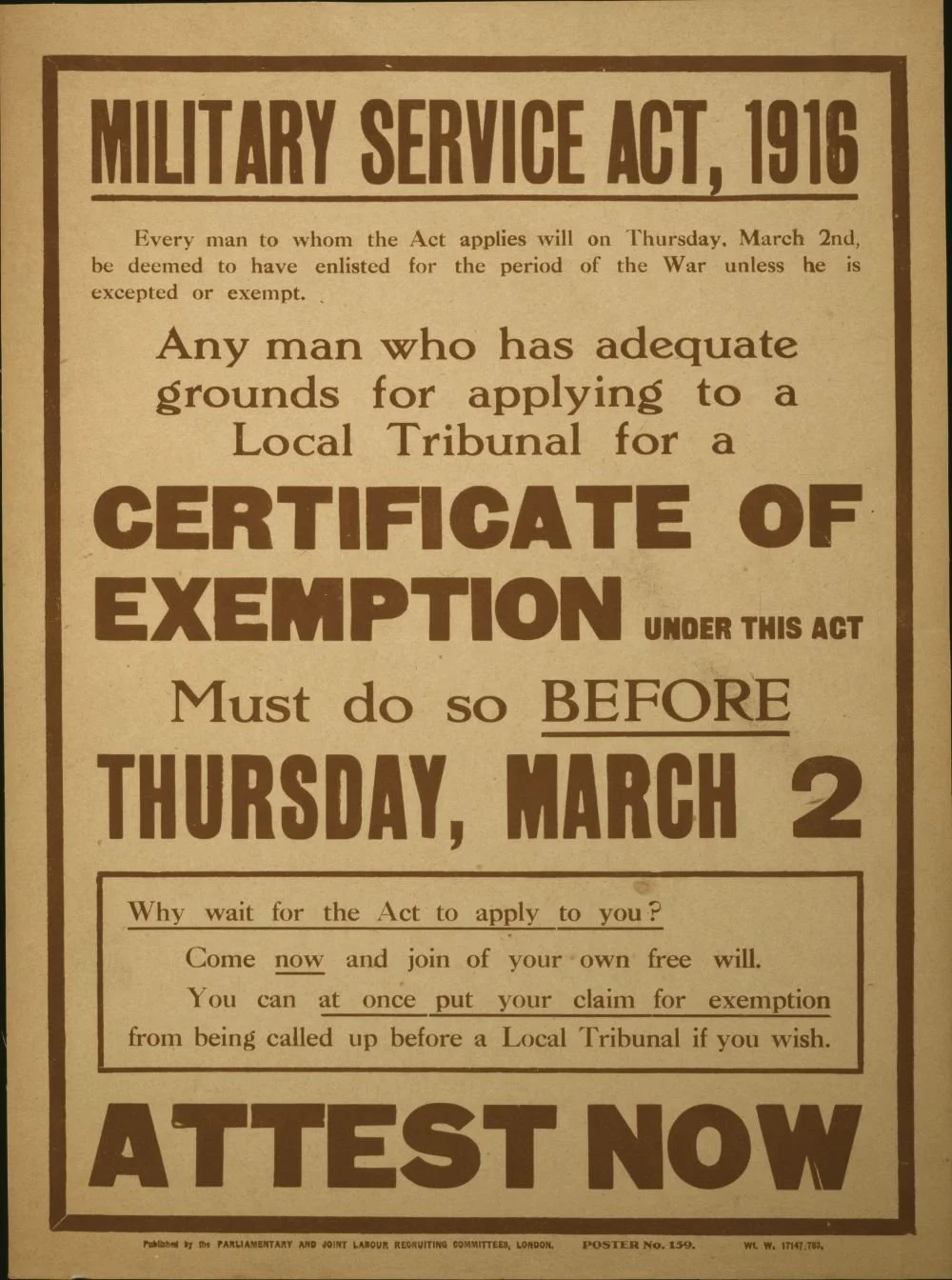 British conscription poster for the Military Service Act 1916. Source London: Parliamentary and Joint Labour Recruiting Committees. Image courtesy of Wikimedia Commons